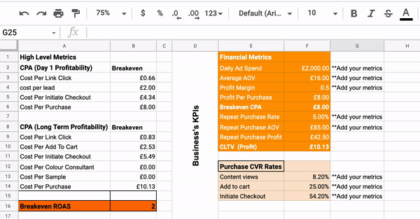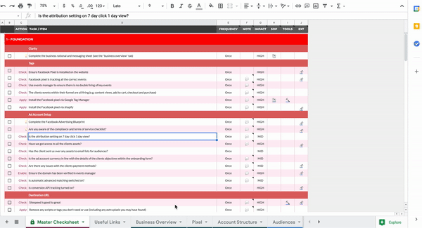You'll get a master checksheet, calcultor for breakeven metrics, useful links, business overview, account structure, pixel overview, naming campaigns and audience tracker.